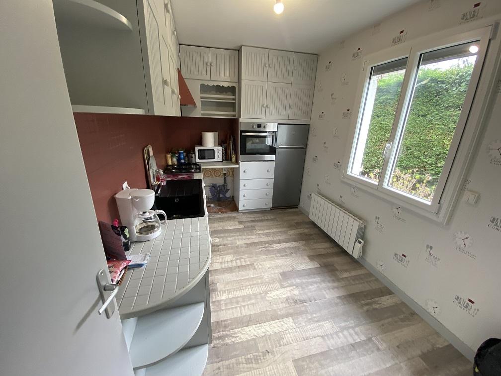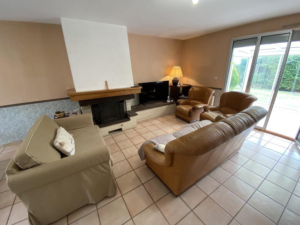 d'une vaste entrée avec placards, séjour salon avec cheminée, véranda, cuisine aménagée, trois chambres, une chambre avec salle de bains, et une salle d'eau.